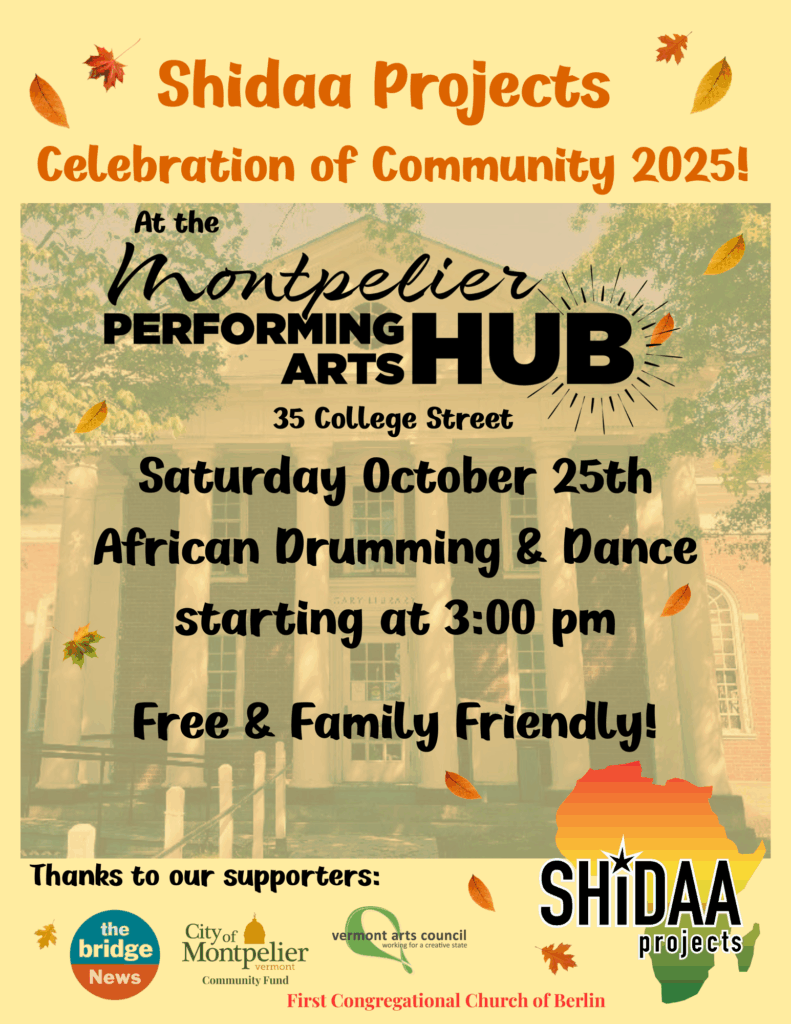Shidaa Projects brings its annual Celebration of Community to a new location this October, the Montpelier Performing Arts Hub! Come share in the joy of West African Drumming and Dance starting at 3:00 pm. We will have light refreshments by donation, and the HUB will be selling beverages.