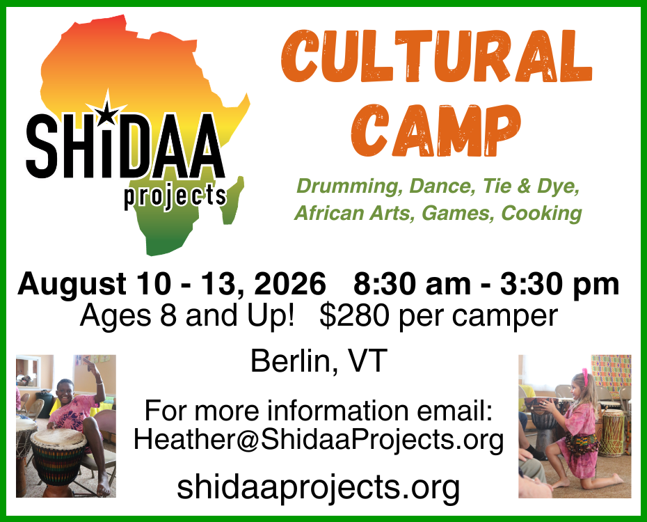 Shidaa Projects’s Cultural Camp is sponsored by 802 Cars and the Montpelier Community Fund.